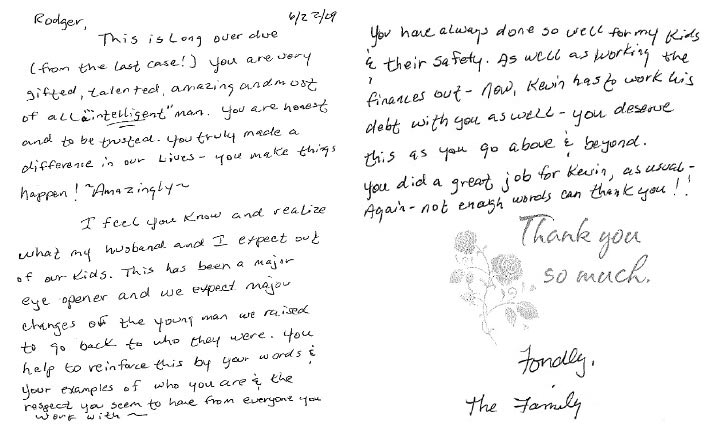 Words cannot express our appreciation for all you accomplished in our son’s special case. You did a phenomenal job. You have truly given him a second chance. Thank you for your time, effort, and expertise.