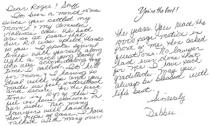 It’s been a month or more since you settled my mom’s and my domestic violence case. We both are so at peace that our R.O was upheld, thanks to you. I spoke several times with yourself along with a nice young lady who was accommodating anytime I called. It is hell for mom and I having to deal with this and you made us feel understood and secure. For the first time in 10 years of this, I feel we have someone on our side. Not many lawyers will handle this type of case. I have talked with many over the years. You read the 10,000-page motion in front of me, then asked questions. No lawyer had ever done that for me. I have such gratitude. May you always be blessed with life’s best.